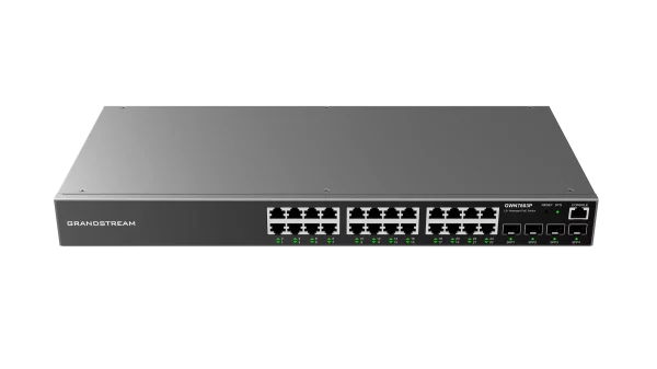 The Grandstream GWN7803P is a 24-port Gigabit Ethernet Layer 2+ managed switch designed for small and medium-sized businesses. It includes four SFP uplink ports for high-speed connectivity and offers a total PoE+ power budget of 360W, delivering up to 30W per port to power PoE devices. Advanced Quality of Service (QoS) features prioritise critical network traffic, while comprehensive security measures protect against unauthorised access. Network management is streamlined through a user-friendly web interface, the cloud-based GWN.Cloud platform, or GWN Manager software. The GWN7803P provides a reliable, scalable, and high-performance networking solution suited for demanding SMB environments.