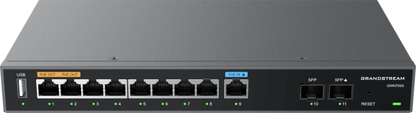 The GWN7003 is a 9-port Gigabit VPN router designed for small to medium-sized business networks. It features one PoE input and two Gigabit PoE output ports for efficient and flexible connectivity. The router supports key functions such as VPN, firewall protection, load balancing, and failover to maintain secure and continuous network operation. Enhanced performance is achieved through advanced Quality of Service (QoS) and deep packet inspection (DPI). Manage up to 150 Grandstream access points locally, or scale easily using the cloud-based GDMS platform for centralised network administration.