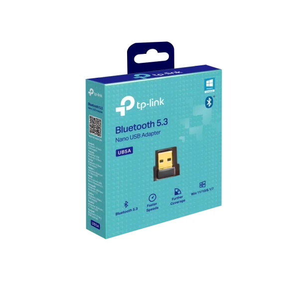 The TP-Link UB5A is an ultra-compact Bluetooth 5.0 nano USB adapter that enhances your PC’s wireless connectivity. It supports up to 7 simultaneous Bluetooth connections, offering improved speed and range over previous versions. Compatible with Windows 11, 10, 8.1, and 7, the UB5A is plug-and-play and ideal for connecting devices like headphones, keyboards, and game controllers.